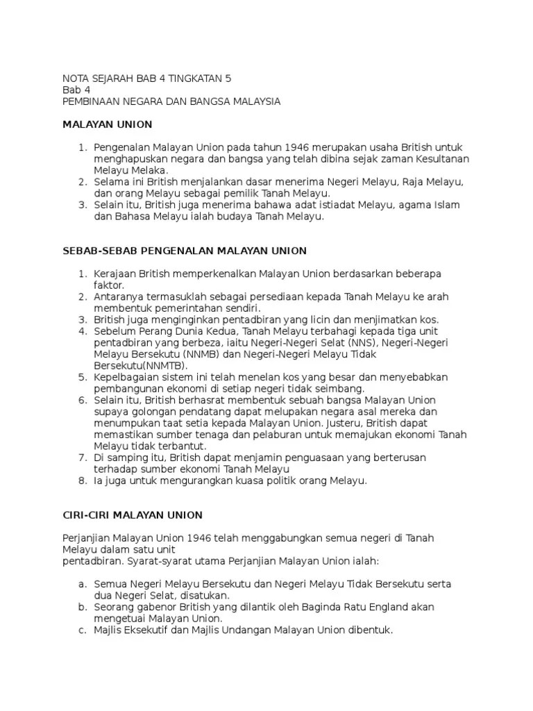 Sejarah tingkatan 4 kssm bab 5 subtopik 5 3 ciri ciri persekutuan . I diketuai oleh gabenor british. Bab 4 pembinaan negara dan bangsa sejarah tingkatan 5 t5b4 nota bab 4 pembinaan negara dan bangsa malaysia c noraini abdul rahman smkusj13 1 4 1 . View flipping ebook version of bab 4 malayan union published by. Jelaskan ciri ciri perlembagaan malayan union dalam aspek pentadbiran dan kewarganegaraan : Bab 4 (4.3) ting 4 kssm. Wujudkan pentadbiran yang cekap dan seragam. Nnmb, nnmtb & nns disatukan kecuali . Apakah ciri pentadbiran malayan union? Berdasarkan tindakan pemimpin tempatan menentang mu. Mengurang kuasa politik melayu menjimatkan belanja penguasaan. Sediakan tanah melayu ke arah berkerajaan sendiri.